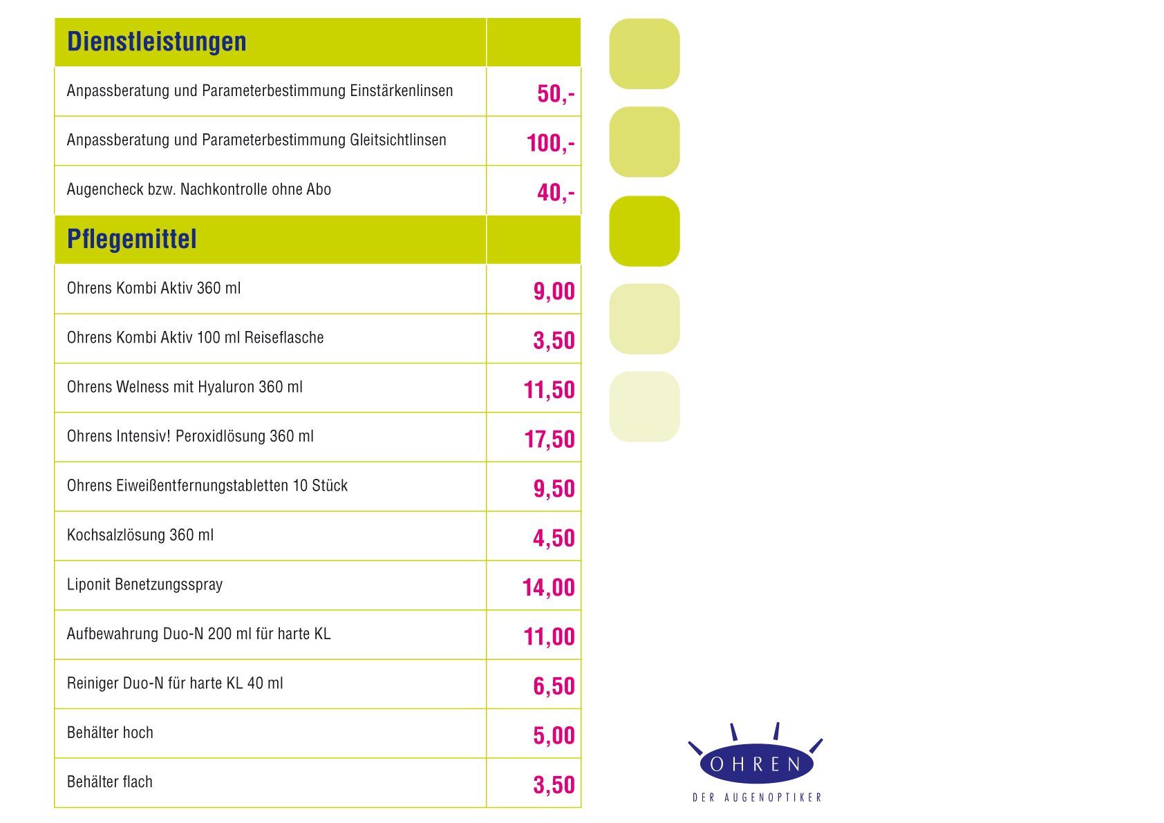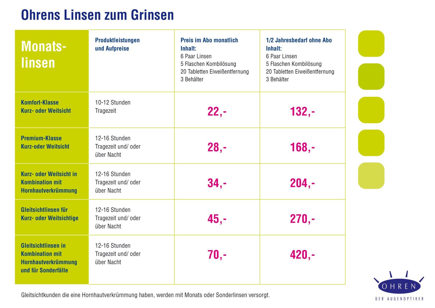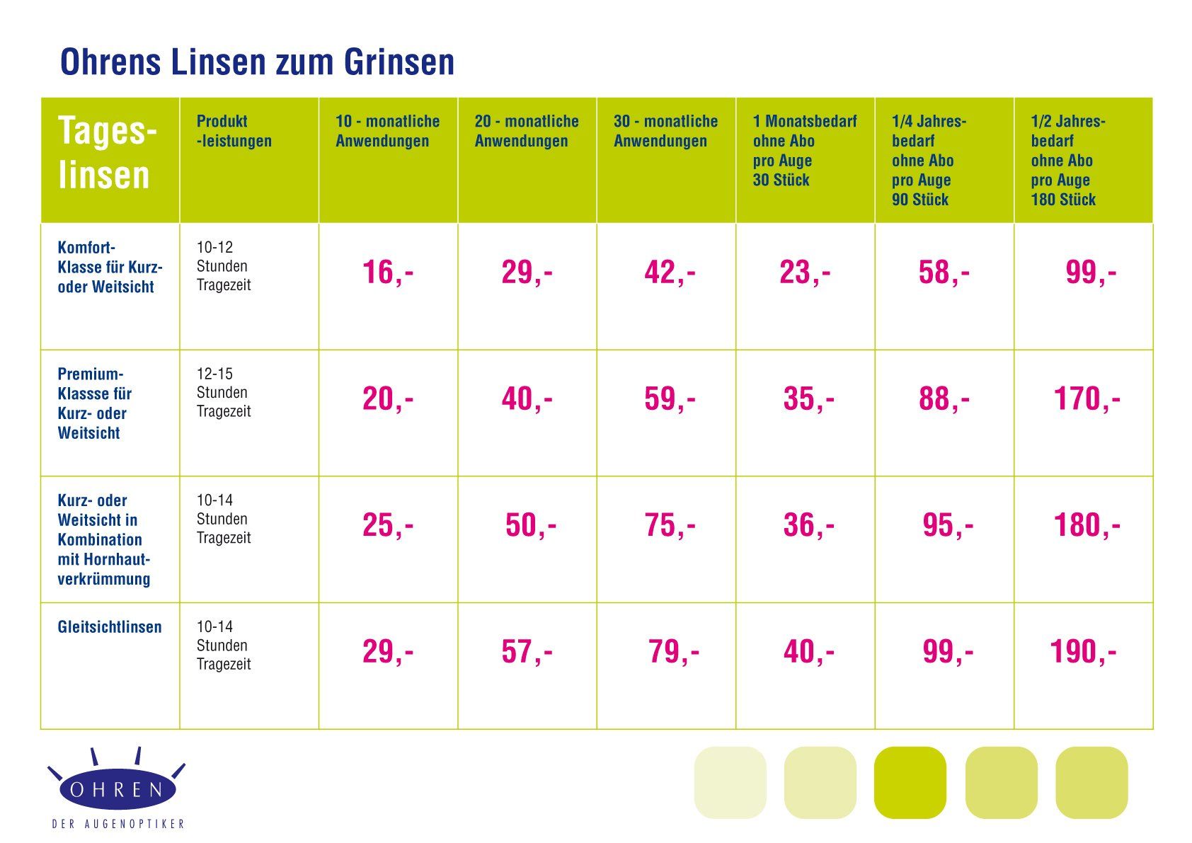 Gerne beraten wir Sie bei der Auswahl Ihrer Linsen. Damit Sie bereits im Vorfeld wissen, was Ihre Linsen kosten, haben wir eine Preisliste mit unseren Angeboten zusammengestellt.